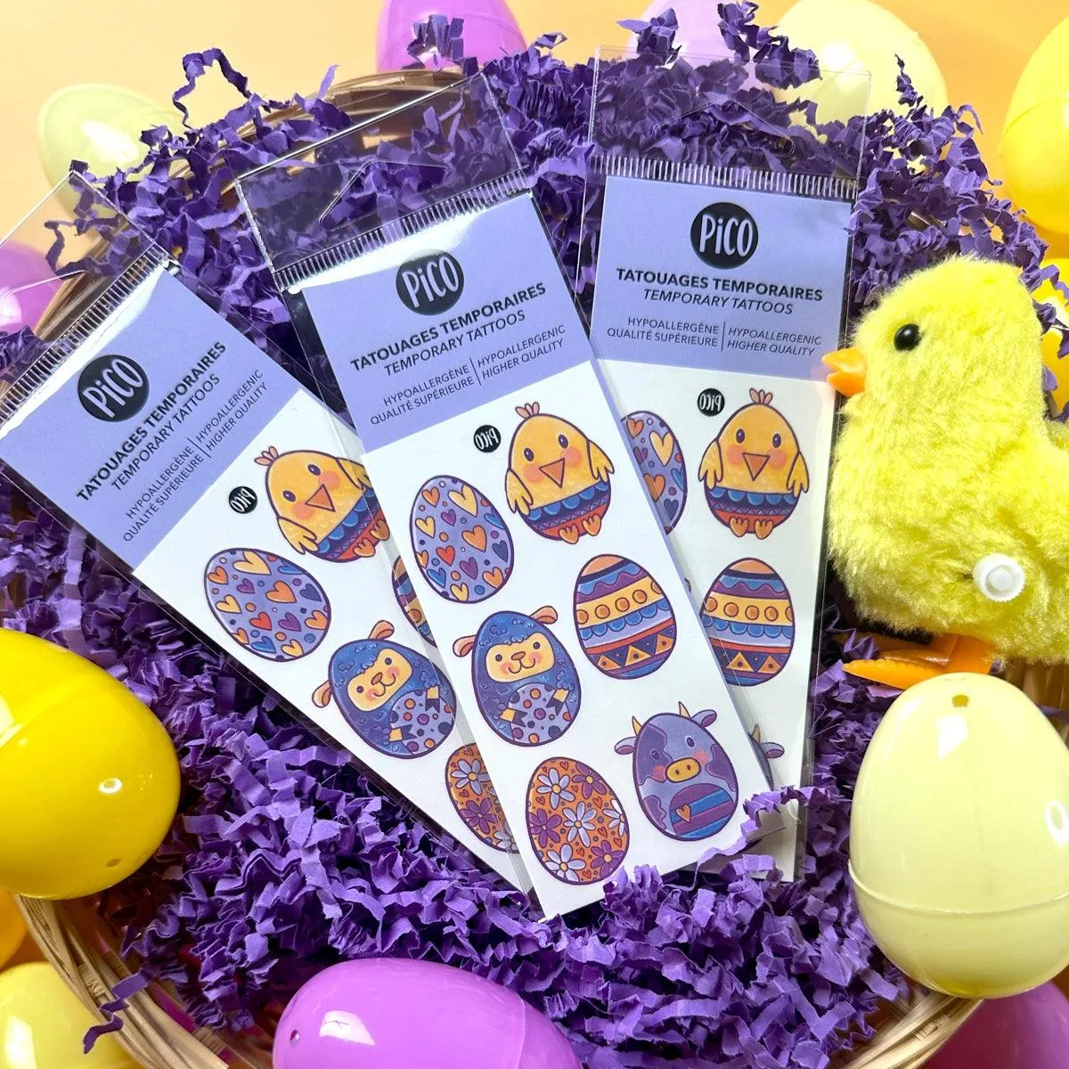 Le poussin, le mouton et la vache en forme de cocos sont trop mignons. Les animaux de Pâques et les jolis cocos décorés sont délicat et plairont aux petits comme aux grands. Accompagnez-les avec le tatouage Les cocos de Pâques pour encore plus d’ambiance de Pâques.